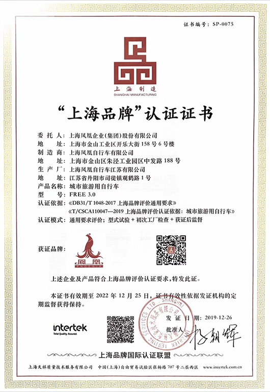 Intertek为凤凰自行车颁发“上海品牌”认证证书